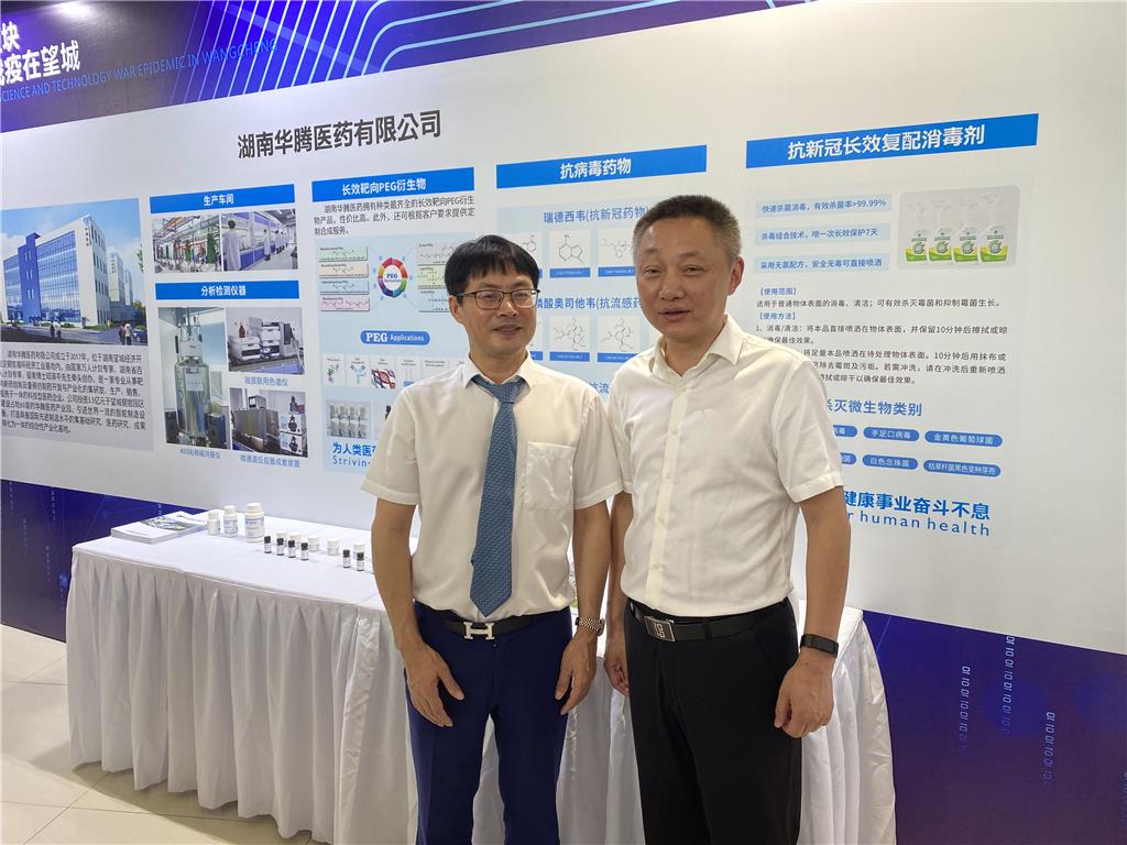在隨后的科技成果展示環(huán)節,前來(lái)華騰醫藥展示區參觀(guān)了解的人絡(luò )繹不絕,華騰醫藥董事長(cháng)鄧澤平先生更是親自接待并熱情耐心地解答他們的疑問(wèn)。華騰醫藥展示區陳列了抗新冠長(cháng)效復配消毒劑、瑞德西韋原料藥等公司自主研發(fā)生產(chǎn)的產(chǎn)品。作為醫藥企業(yè),華騰醫藥利用自身抗病毒藥物技術(shù)研發(fā)優(yōu)勢,在抗擊新冠疫情中發(fā)揮了重要作用。