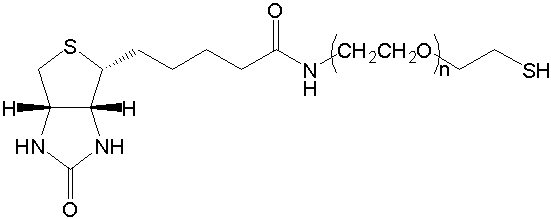 SH-PEG-Biotin中的生物素通過(guò)穩定的酰胺接頭與線(xiàn)性PEG綴合,從而具有活性游離巰基,SH,半胱氨酸,巰基或巰基。SH-PEG-Biotin可通過(guò)生物素/鏈霉抗生物素蛋白結合測定可以容易地檢測生物素,因此廣泛用于分子靶標檢測。